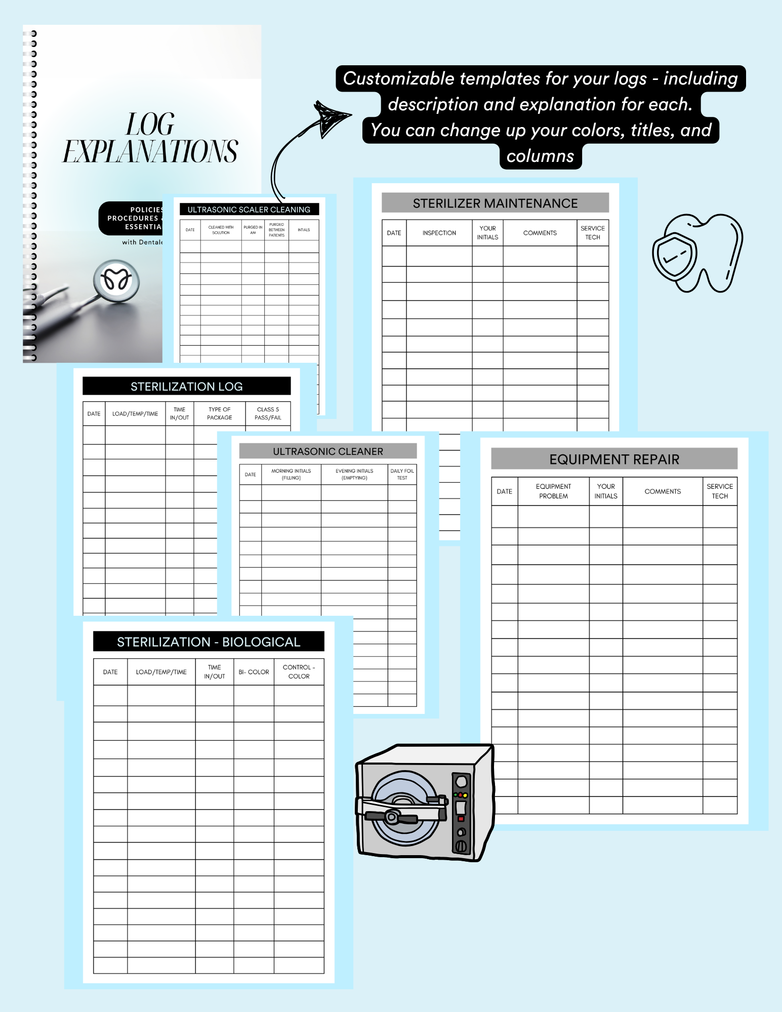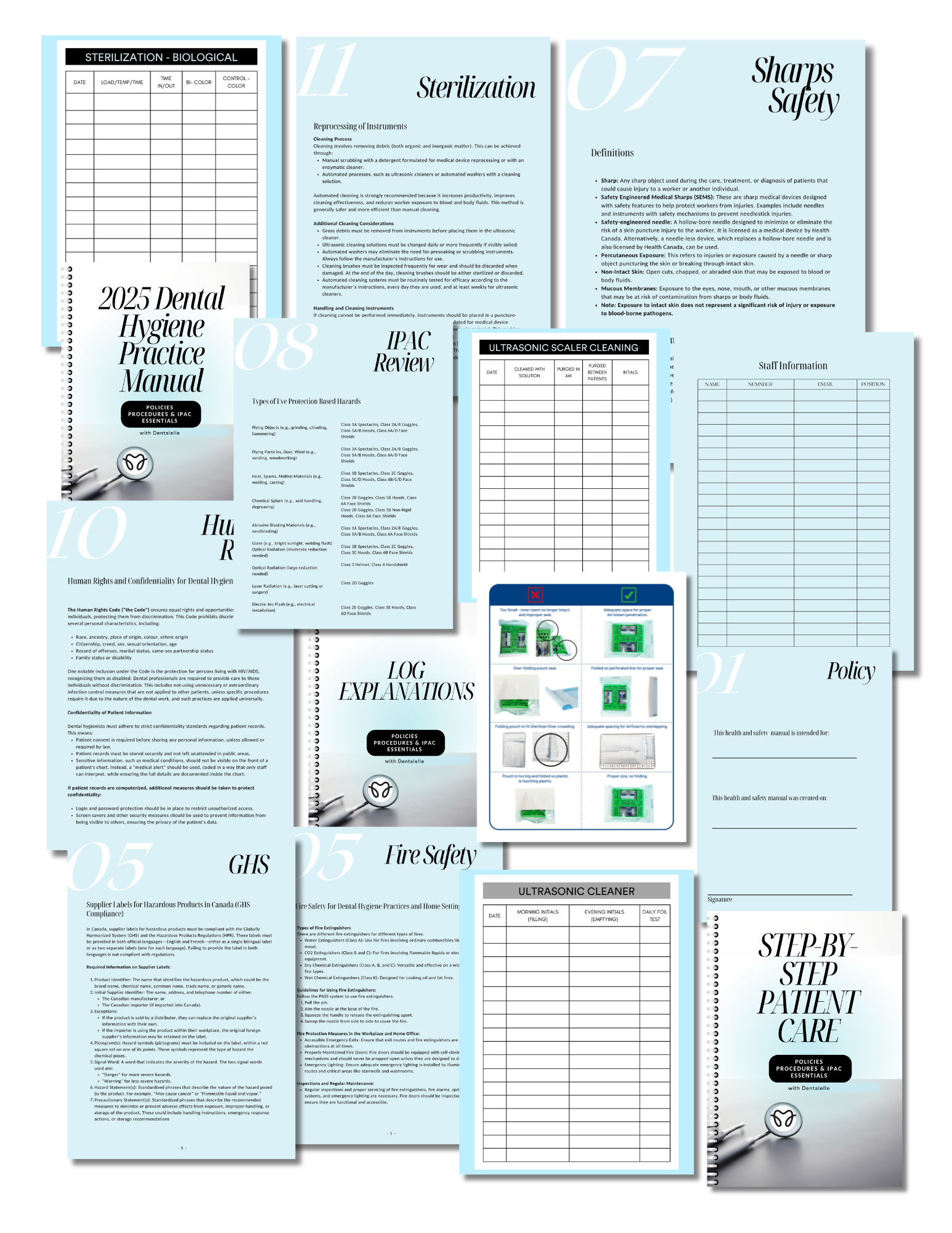 This package includes 12-page control log templates, 25 page log descriptions for each template, a 112-page health and safety manual with IPAC, a 10-page step-by-step mobile dental hygiene manual, printable documents, instructional videos, and more!