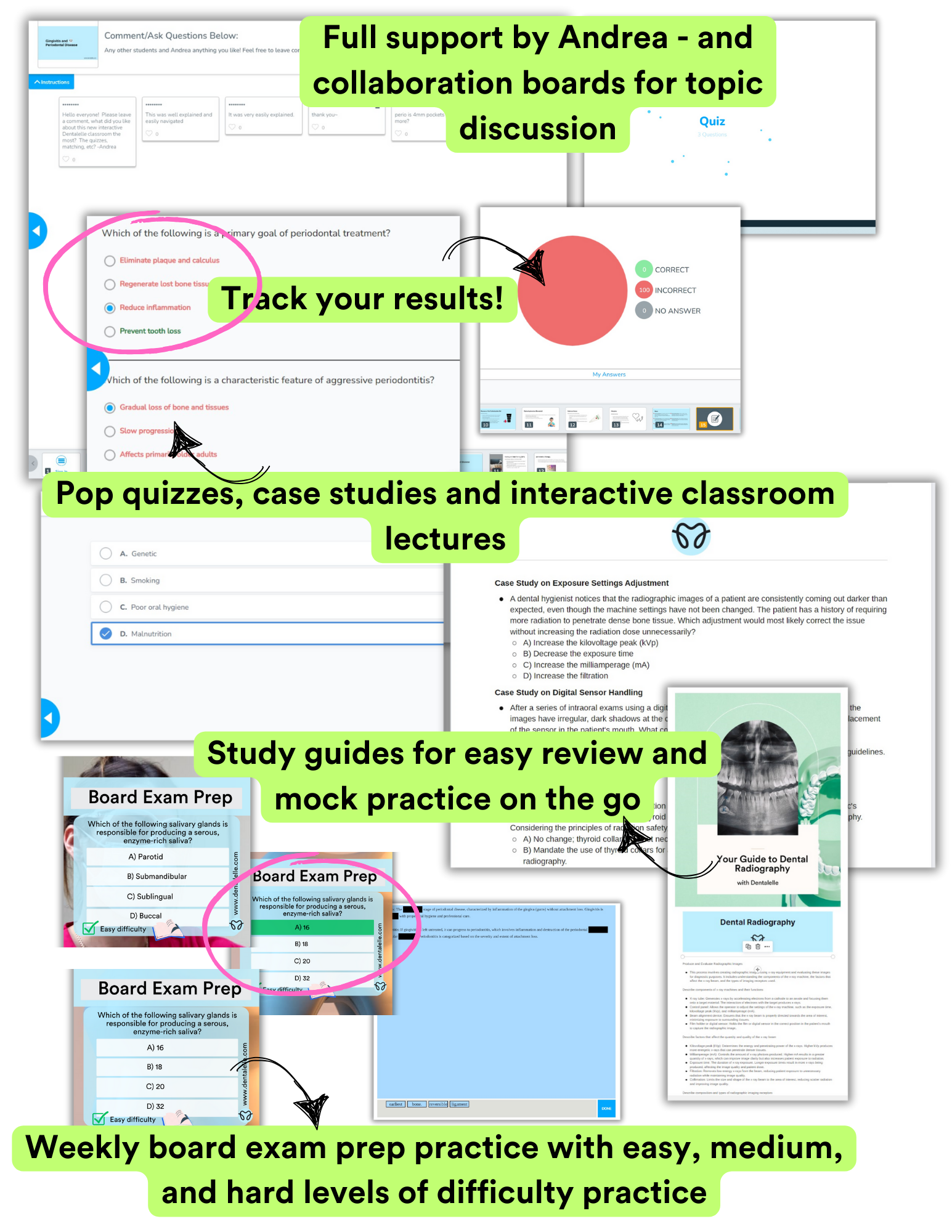 Pass on your FIRST ATTEMPT - 99.7% success rate and voted #1 Board Exam Prep for Dental Assisting Students. A combo of self paced, live and recorded interactive classrooms, quizzes, case studies and study guides