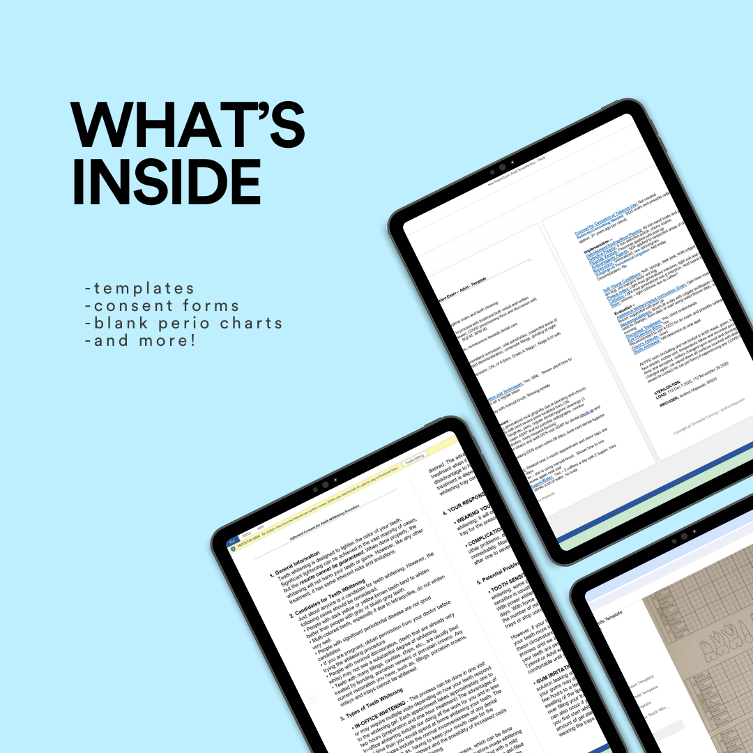 You will find adult and child new patient templates, consent forms, blank odontogram and perio charting if you prefer the paper versions, an online form tool, and more..