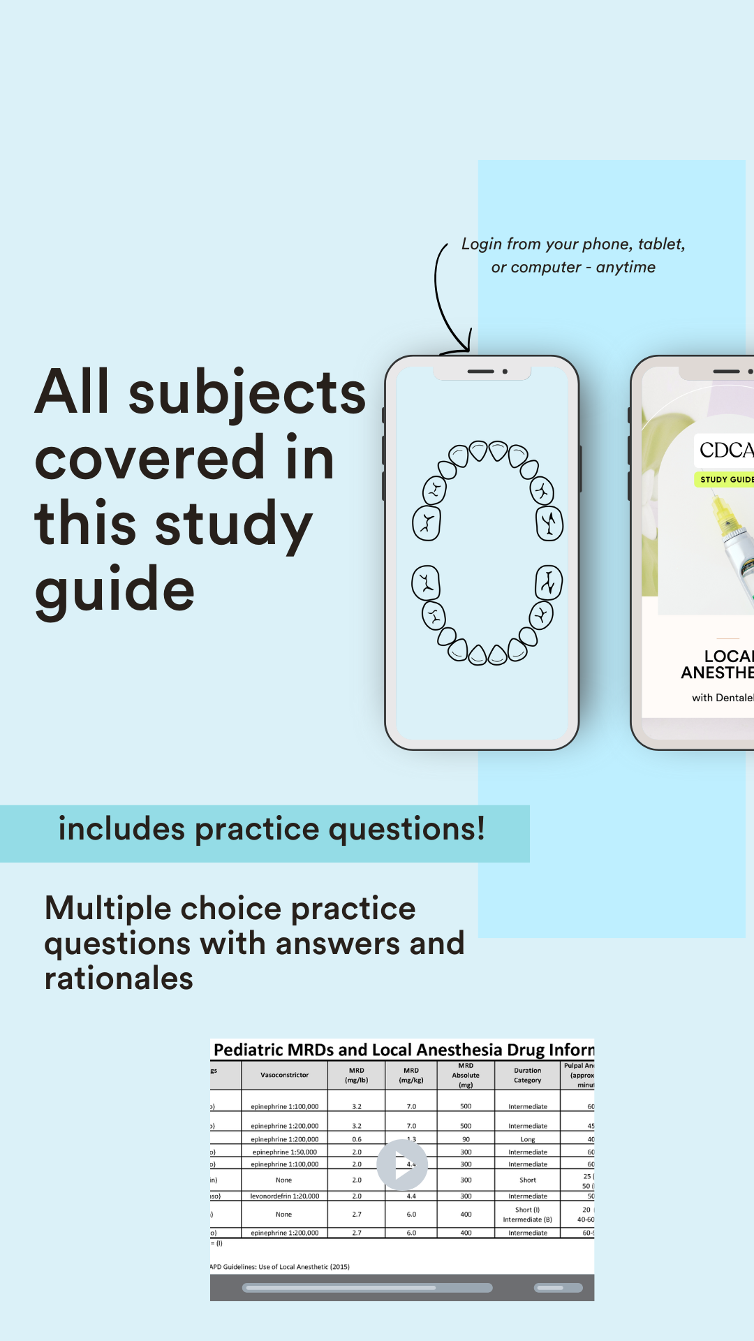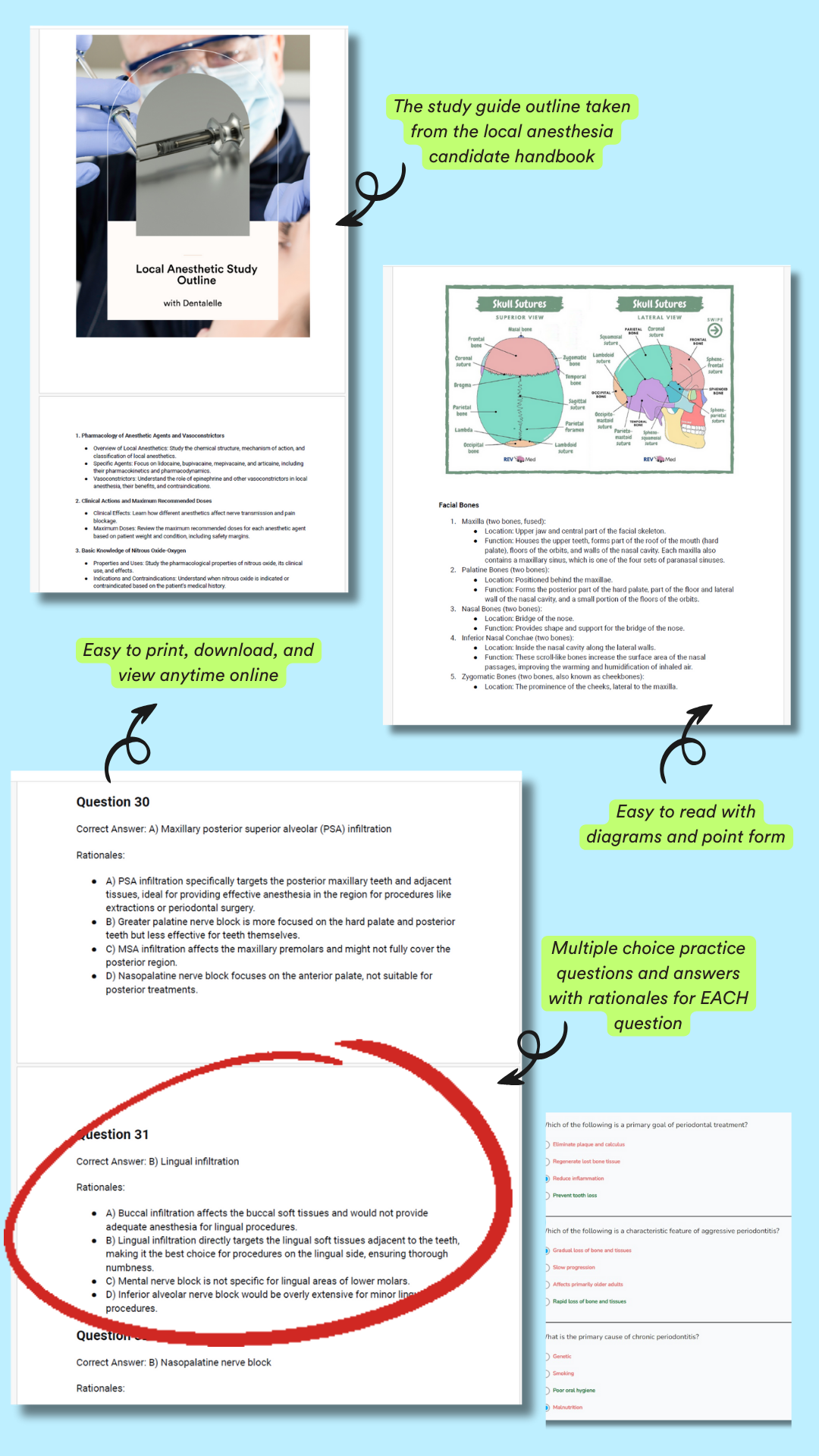 For the CDCA-WREB Exam. A full versed 85 page study guide with mock question practice with answers and rationales. 100's of practice questions.