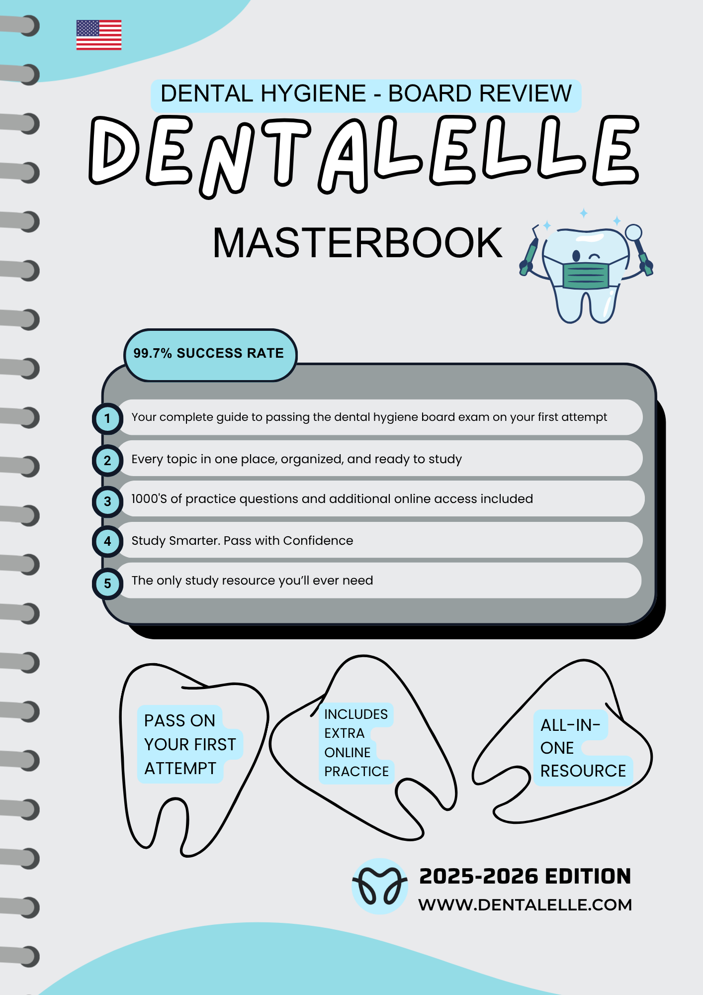 The Dentalelle Masterbook is your complete study companion for the board exam — beautifully formatted, easy to read, and packed with every essential topic in one place. Created by a dental professional and tutor since 2005, this guide makes studying for the boards simple, organized, and stress-free. All topics included in the book.
