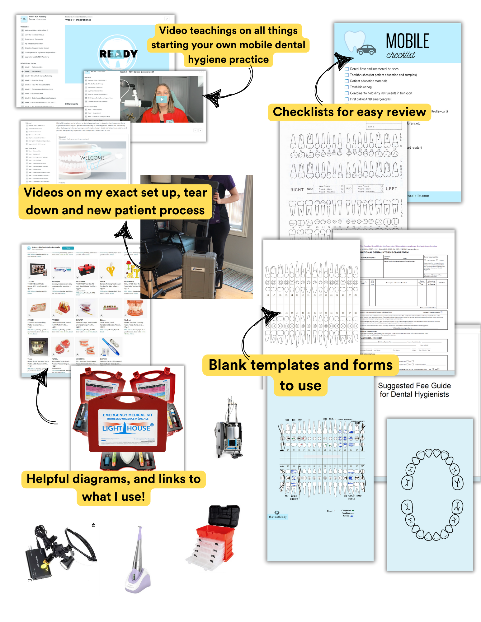 See videos (40+ videos) forms, checklists, and templates - all inside the course. Including a private Facebook group for independent dental hygienists where we all network and support each other.