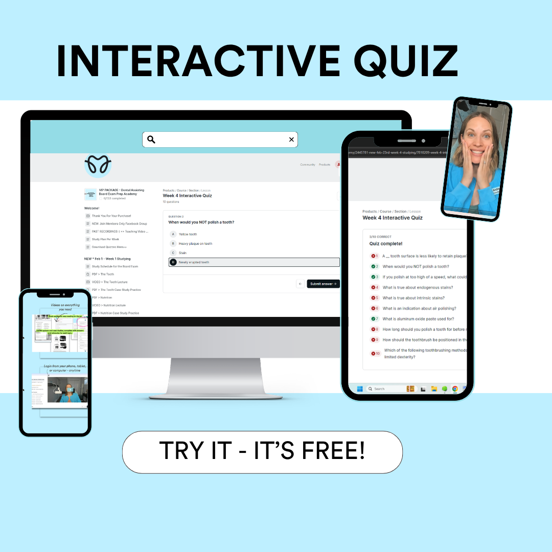 For full online preparation, sign up for the Quality Assurance Written Test Prep Online Course here: https://dentalelle.podia.com/quality-assurance-study-guide-for-the-rdh , includes mock exams and all materials you need to pass the exam (with a 98%+ success rate so far!)
