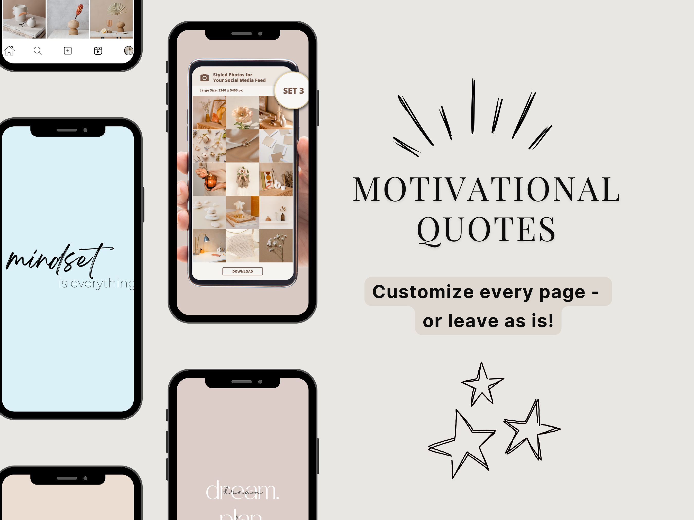 Download your 77 pages of motivational quotes and images you can use for your own social media! Customize fully in Canva (PRO account not required)